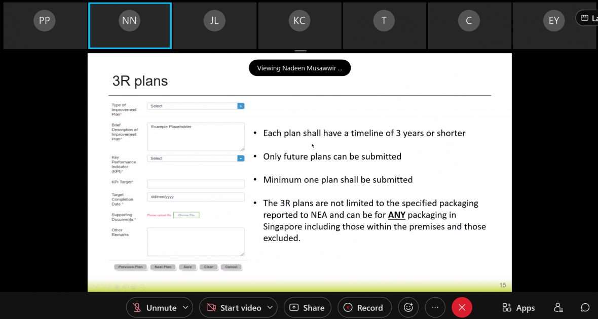 A Mandatory Packaging Reporting (MPR) Clinic was held between 24 to 26 Nov, and on 30 Nov 2021. The session was held to assist companies in their first MPR reporting obligation, which is due in the 1st quarter of 2022. An NEA officer Mr Nadeen Musawwir was present to answer questions from the attendees. Each session began with a short presentation and overview of the MPR, followed by a Q&A session to clear any doubts and concerns companies faced. A total of 12 1-hour sessions were held with up to 200 business representatives from over 100 companies, such as packaging producers, food manufacturers and retailers, were virtually present.