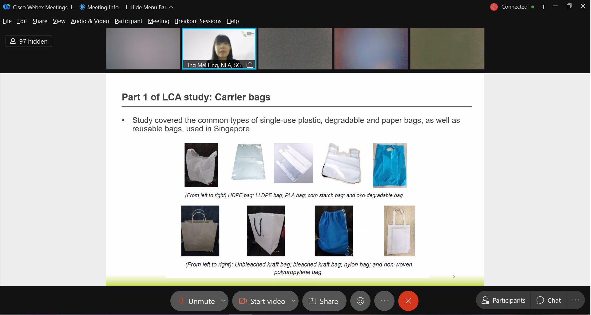 Ms Tng Mei Ling shared on the LCA study on single-use plastic, degradable and paper bags, as well as reusable bags.